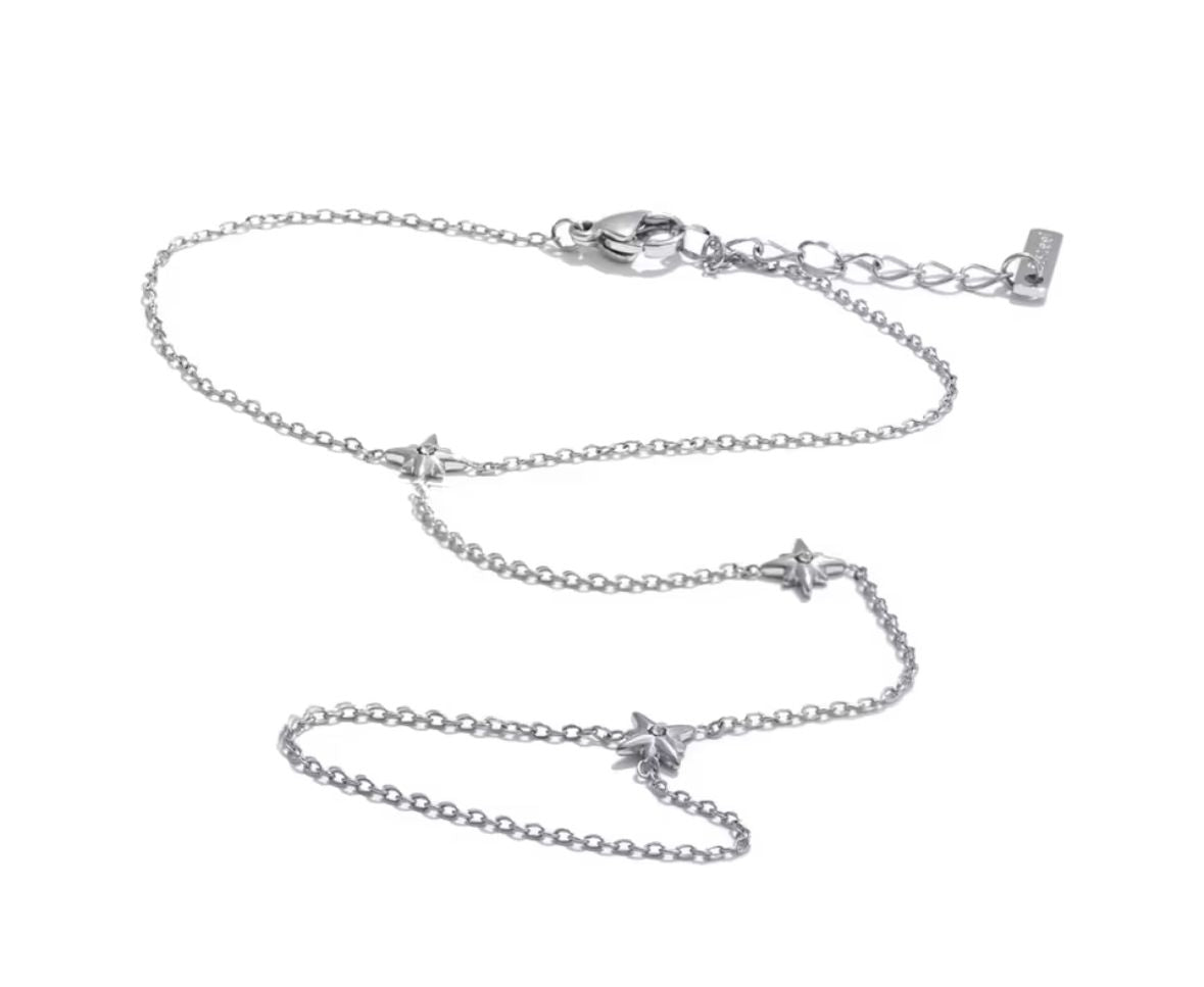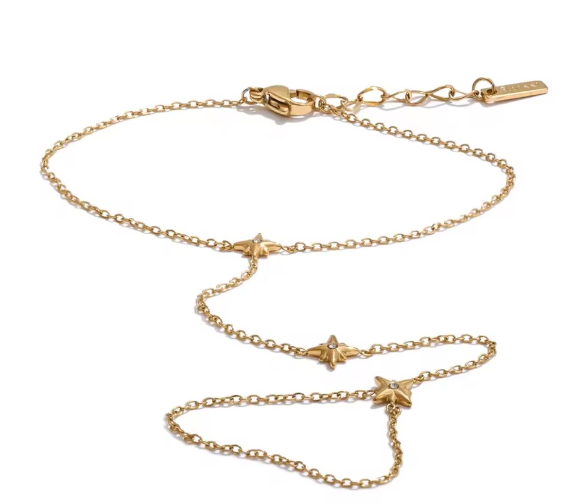 Elevate your elegance with the Dainty Multiple Zirconia Stars Hand Chain, a stunning fusion of delicacy and sophistication. Designed to drape beautifully across your hand, this exquisite piece connects a sleek bracelet to a refined ring, creating a seamless, graceful look. Crafted from hypoallergenic, water-friendly materials and plated in luxurious 18kt gold, it offers lasting shine and all-day comfort. Whether worn alone for a statement of effortless beauty or layered for a bolder effect, this hand chain bracelet is the perfect touch of modern glamour.