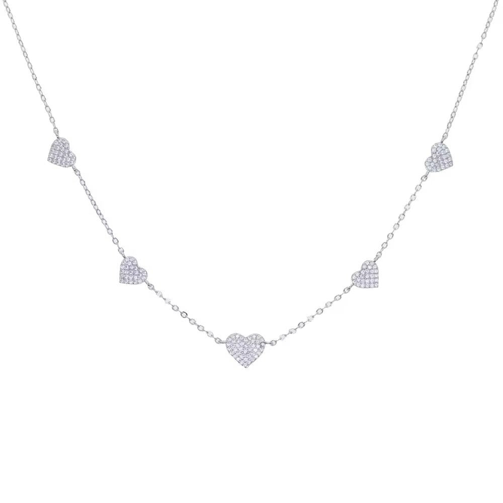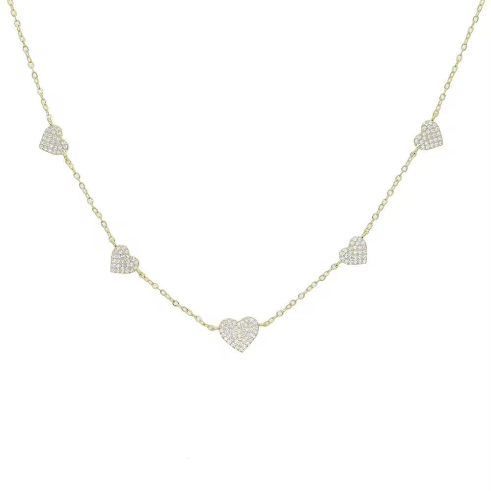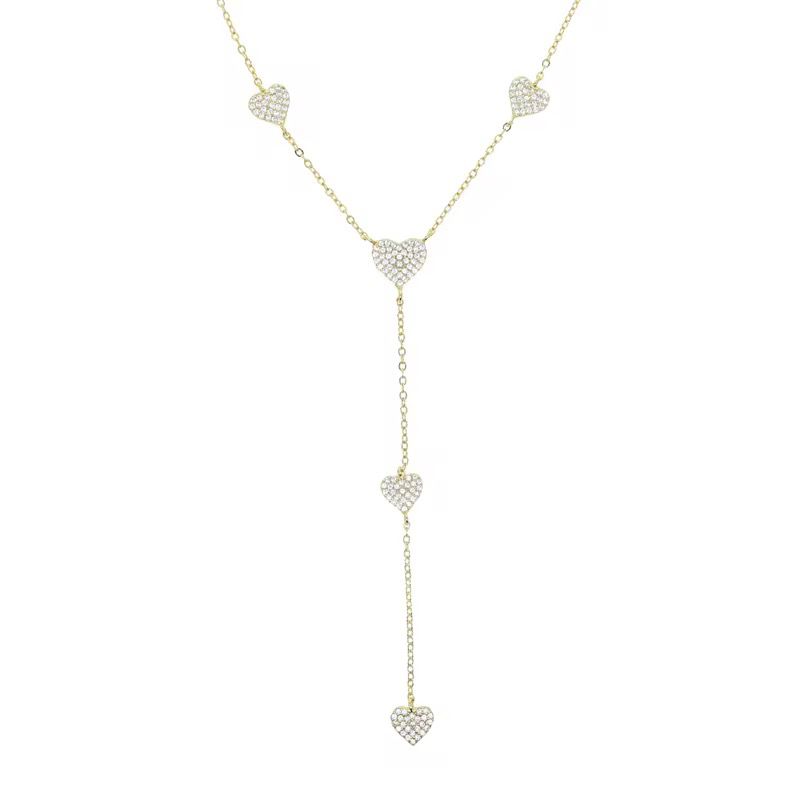 Delicate yet dazzling, the Cinq Cœurs Necklace is a graceful expression of love and luminosity. Finished with a radiant 18kt PVD gold plating, this necklace features five petite heart pendants suspended along a sleek chain, each heart adorned with micro pavé-set 5A cubic zirconia for a soft, sophisticated sparkle.