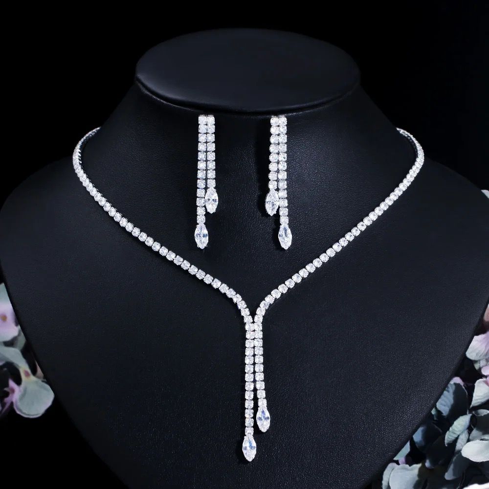 Unleash your inner sparkle with the Glamour Tassel Cubic Zirconia Jewelry Set, designed to dazzle at every celebration. This high-quality set includes a pair of statement tassel earrings and a matching necklace, both adorned with pave-set cubic zirconia stones that catch the light with every movement. Plated in luxurious 18k gold, this stunning set offers a perfect balance of sophistication and bold style, making it the ideal accessory for parties, weddings, and glamorous evenings out. Elevate your look with this exquisite design that adds a touch of sparkle and elegance to any outfit.