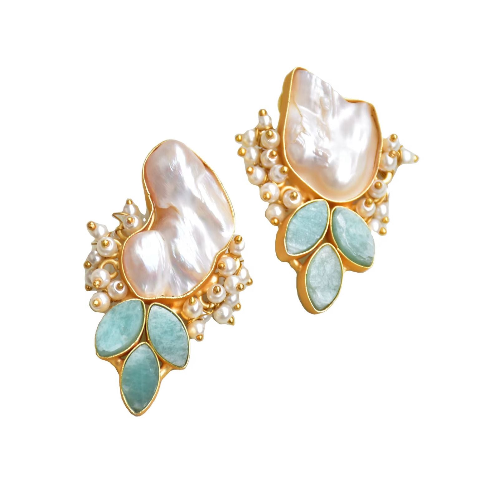 These handmade earrings & pendant are a stunning fusion of elegance and craftsmanship, meticulously crafted with high-quality brass and adorned with Baroque, Pearl and Amazonite stones.