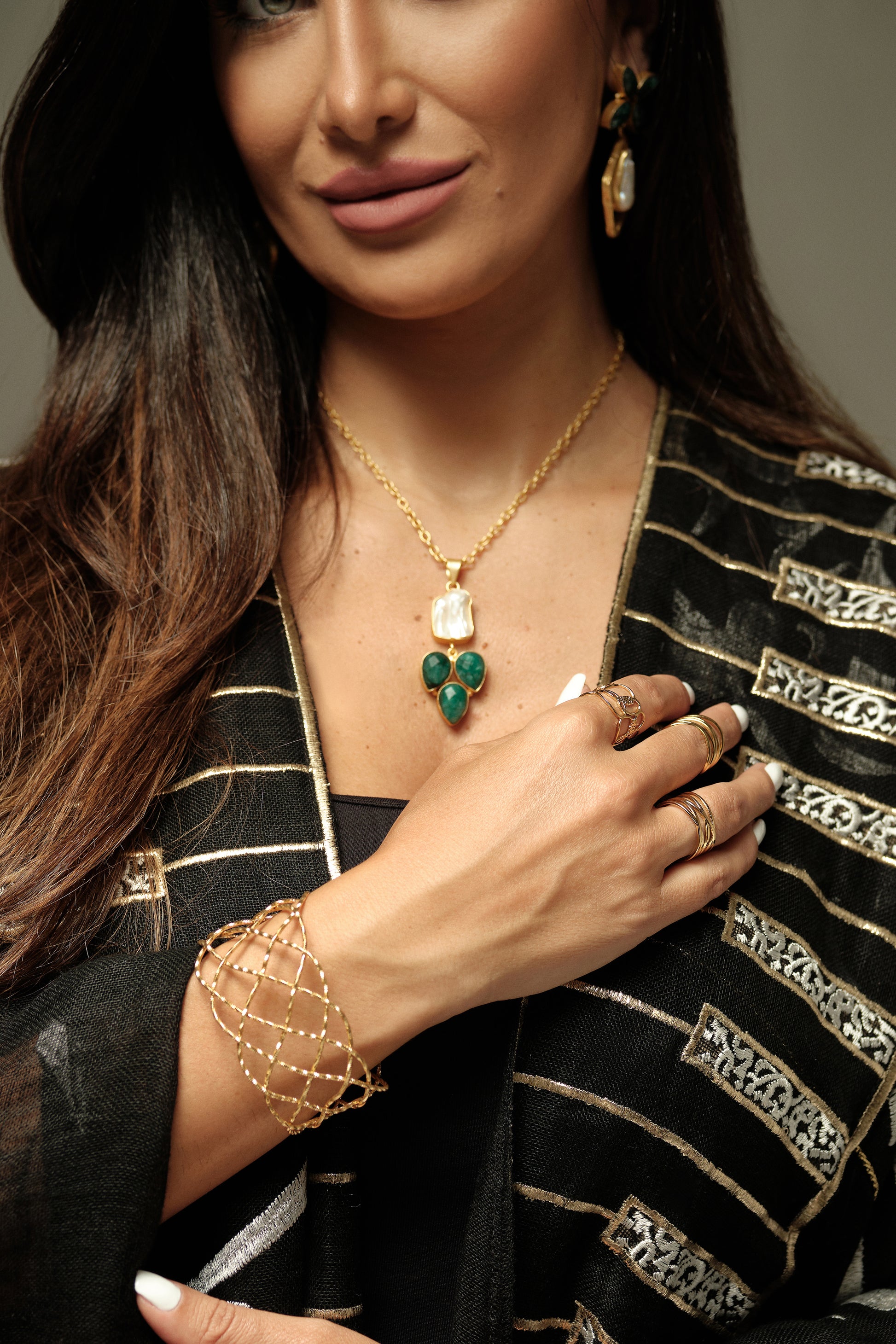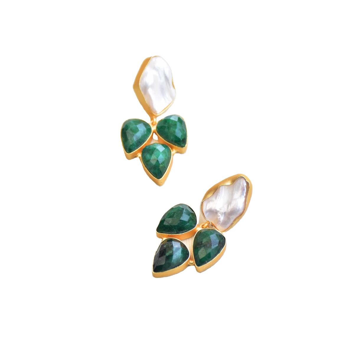 These handmade earrings & pendant are a stunning fusion of elegance and craftsmanship, meticulously crafted with high-quality brass and adorned with Baroque and Emerald stones.