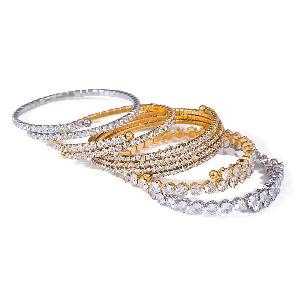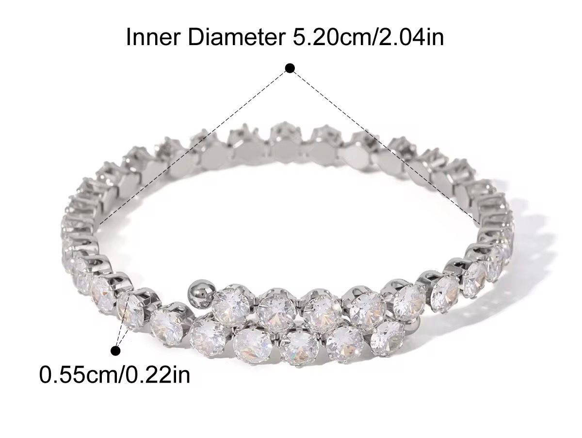 Elegance meets brilliance with the Celeste Zircon Bangle, a timeless piece designed to add effortless sparkle to your look. Featuring a sleek, opening-closed design adorned with radiant zircon stones, this bracelet is crafted from hypoallergenic, water-friendly metal and plated in 18kt gold for a luxurious, tarnish-resistant finish. Whether worn alone for a touch of sophistication or stacked for a statement effect, this bangle is the perfect fusion of grace and glamour.