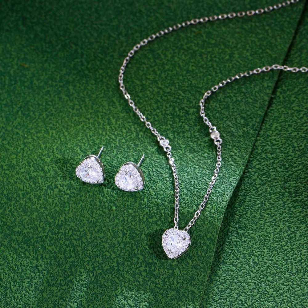 The matching necklace features a charming heart pendant, also encrusted with sparkling cubic zirconia, suspended from a fine sterling silver chain. The pendant hangs gracefully, adding a subtle yet glamorous focal point to the necklace, making it an ideal piece for layering or wearing alone.