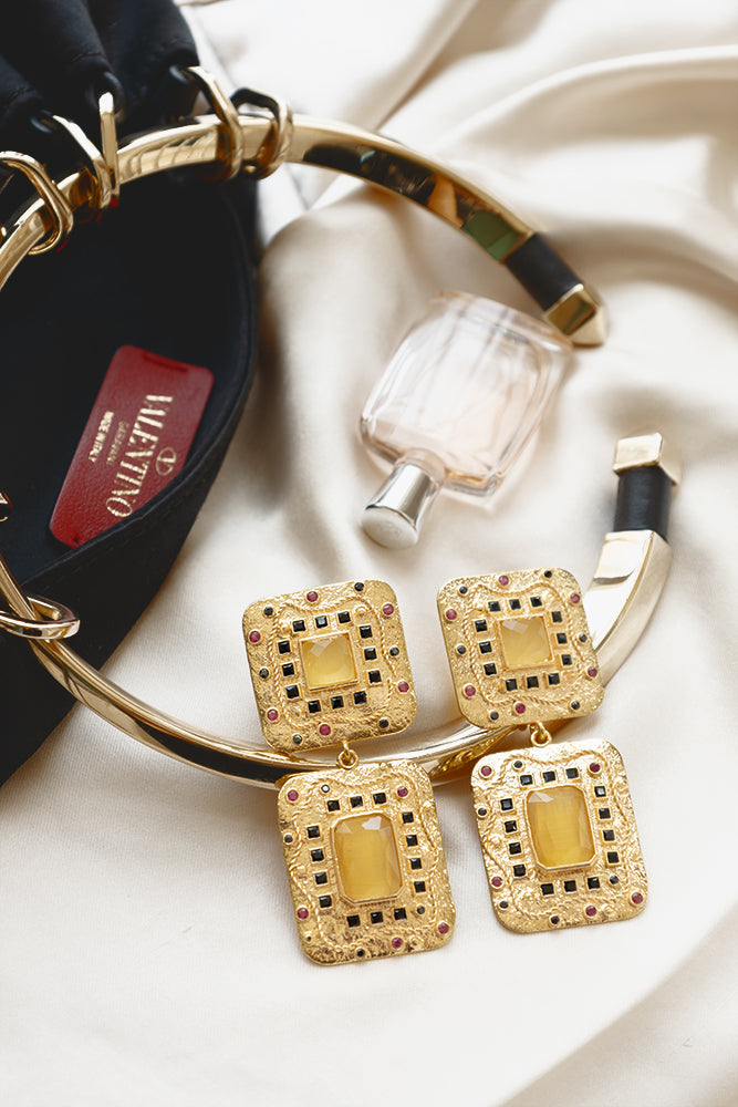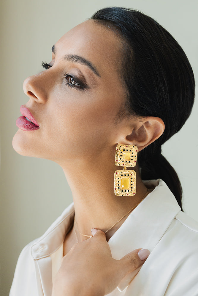 Each piece is coated with luxurious 18kt gold, adding a radiant finish that enhances their sophisticated appeal. Perfect for adding a touch of elegance to any outfit, these earrings are a beautiful blend of natural elements and artisanal expertise.