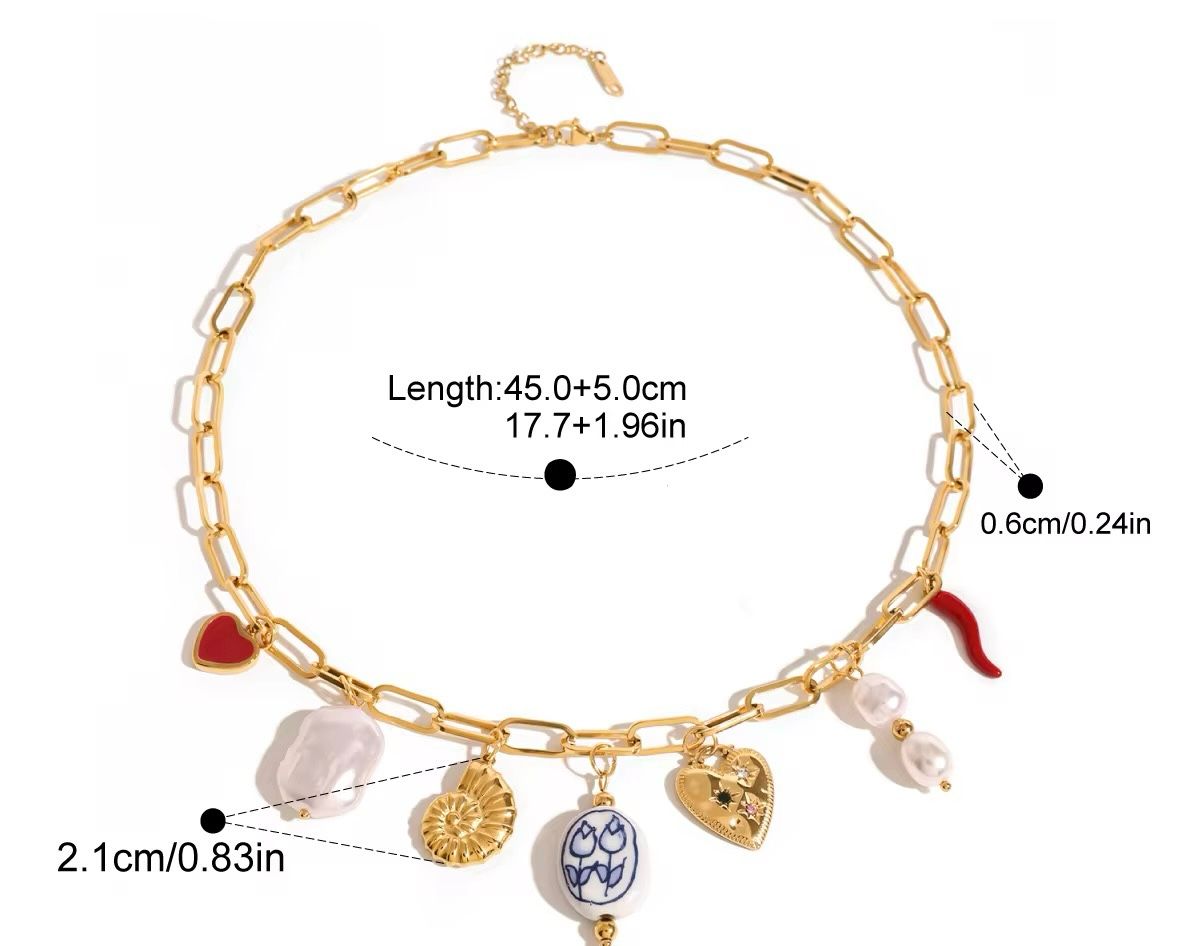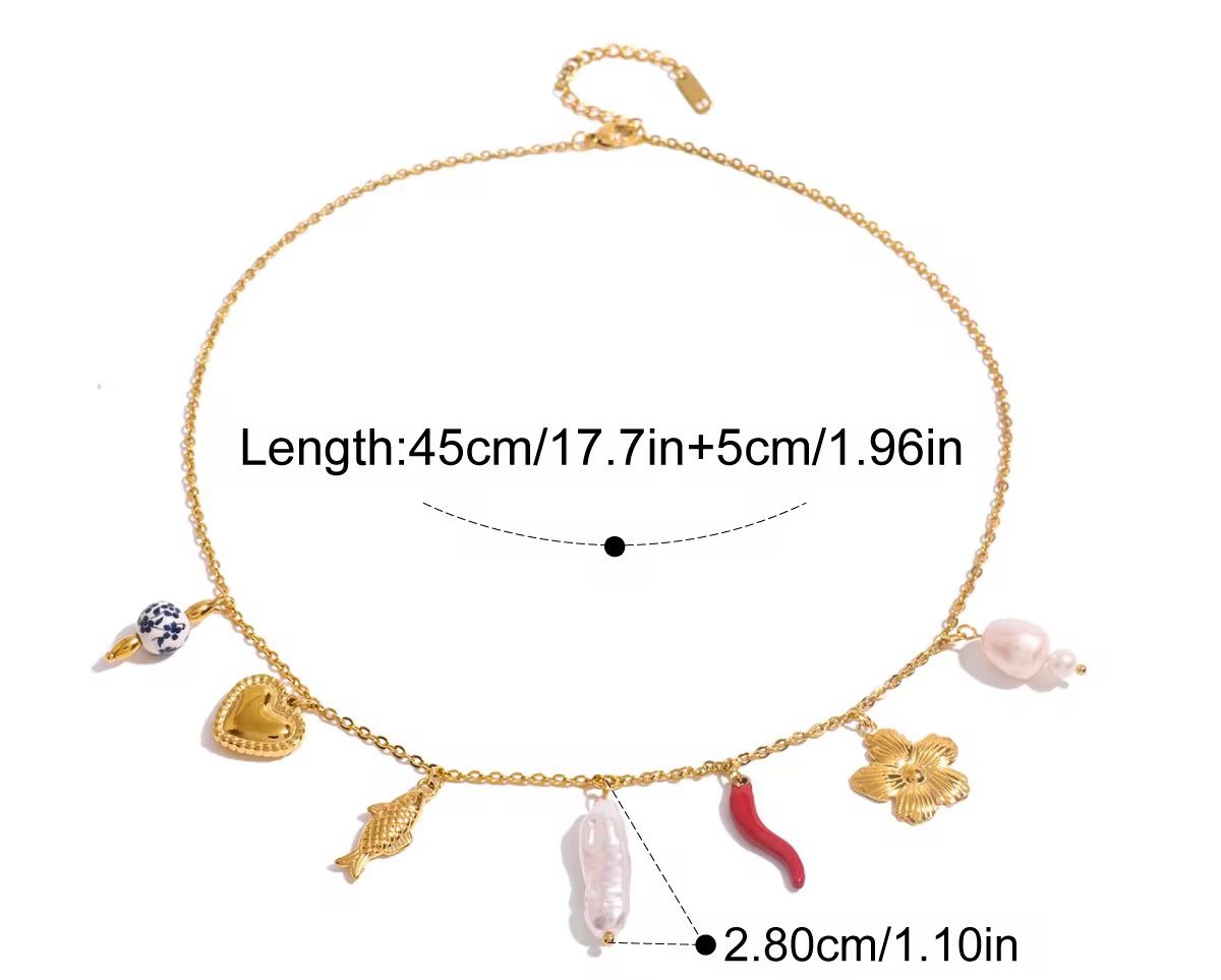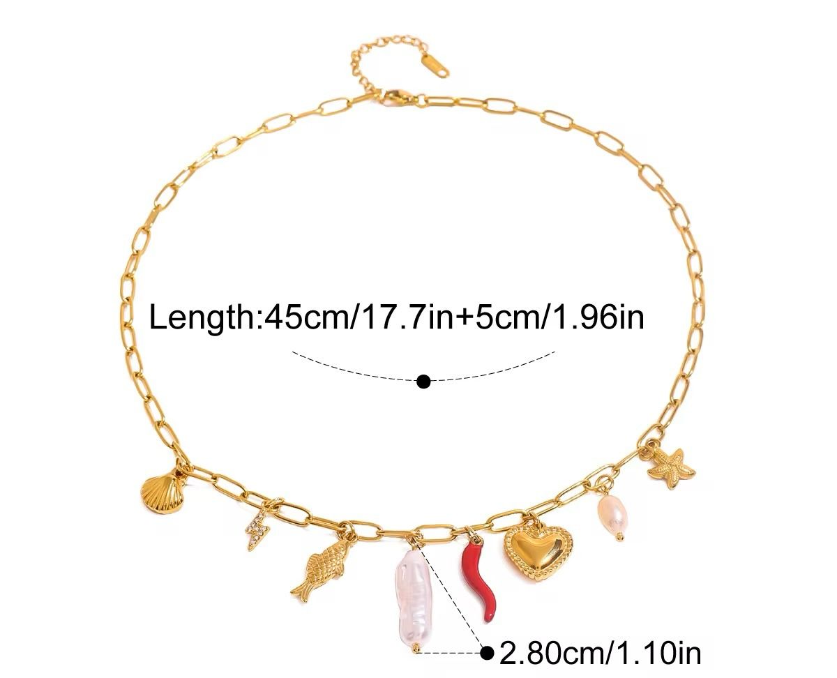 Immerse yourself in the beauty of the ocean with the Seafarer’s Treasure Necklace, a breathtaking blend of shell, ceramic coral, starfish, conch, sea snail, fish, pearl, and marble pearl shell charms. Inspired by the wonders of the sea, this exquisite piece is crafted from hypoallergenic, water-friendly metal and plated in 18kt gold for a lustrous, tarnish-resistant finish. Whether you're strolling along the shore or bringing coastal elegance to your everyday look, this necklace is a timeless celebration of the ocean’s magic.