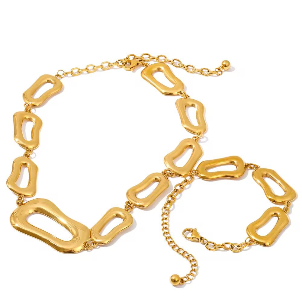 Modern minimalism meets timeless shine in the GeoGlow Set, featuring a matching necklace and bracelet with sleek geometric hollow designs. Clean lines and open shapes create a bold yet refined statement, perfect for elevating both casual and dressed-up looks.