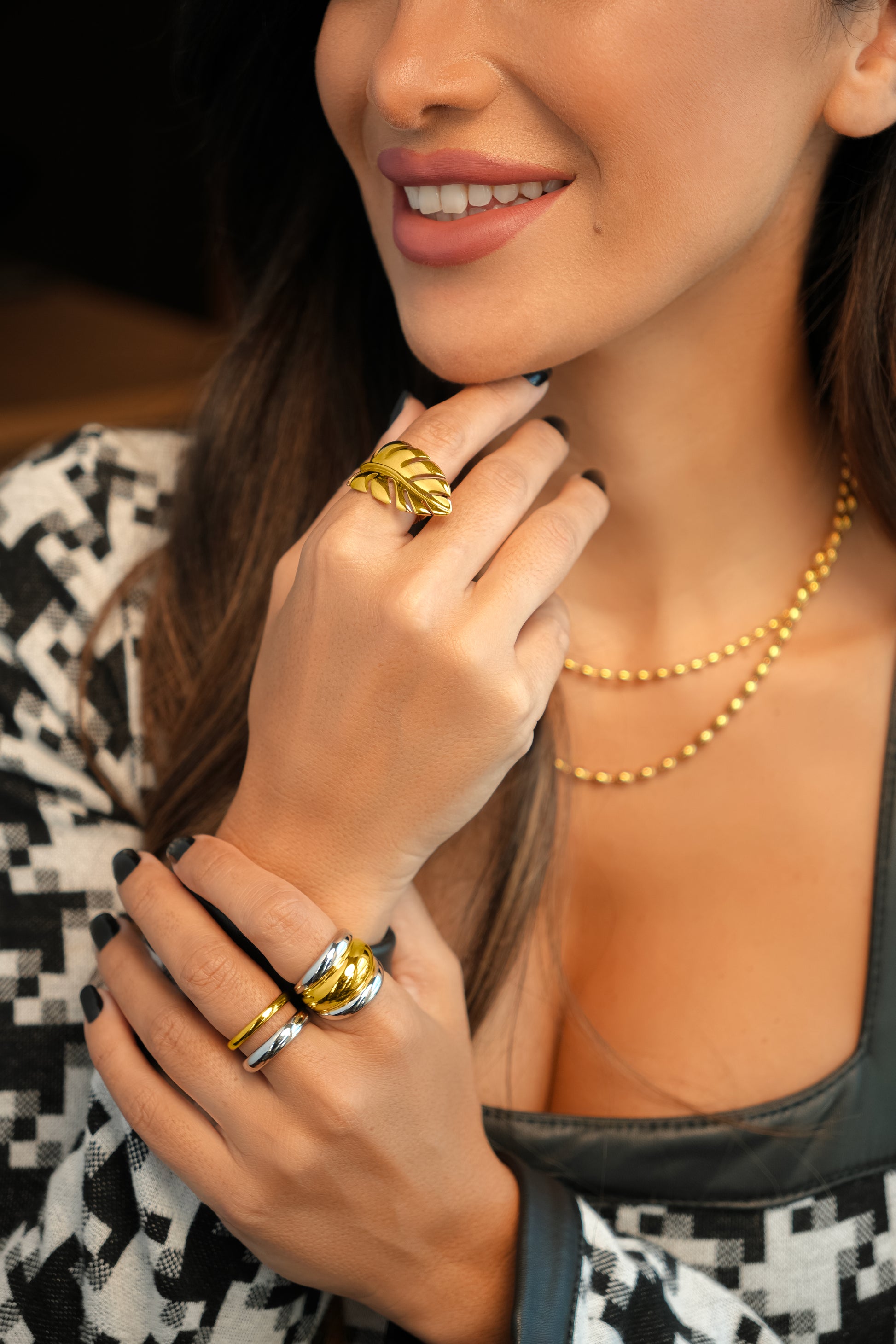 Embrace nature-inspired elegance with the Golden Leaf Elegance Ring. Featuring a long, delicately designed leaf motif, this ring is plated with 18kt gold and crafted from high-quality stainless steel for a luxurious finish. The flowing curves of the leaf design add a touch of organic beauty, making it a statement piece for any occasion. Hypoallergenic and water-friendly, this ring offers all-day comfort and durability. Perfect for women who appreciate sophisticated, nature-inspired jewelry, the Golden Leaf Elegance Ring brings timeless charm and grace to your collection.